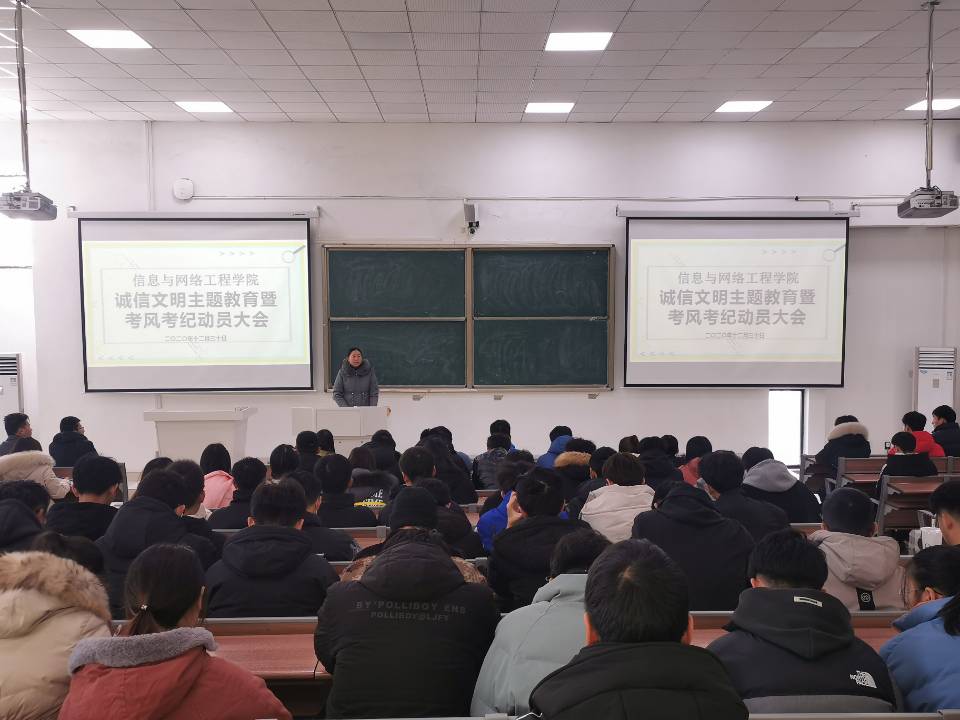 为进一步提高大学生的诚信文明素养,加强考风考纪教育。12月30中午,信息与网络工程学院于致知楼A111召开诚信文明主题教育暨考风考纪动员大会。学院副处级辅导员韦乃学,专职辅导员王培培、陈凯、李军成、崔北坤以及20级各班学生干部参加会议,会议由王培培主持。